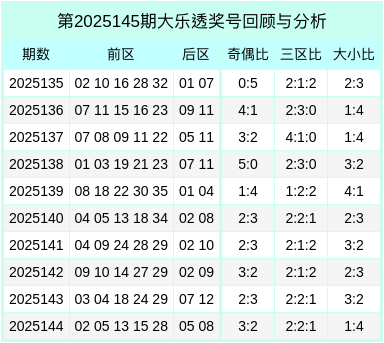 当期前区号码大小比为1:4,三区比为2:2:1,奇偶比为3:2。