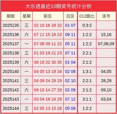 开奖回顾:大乐透2025144开奖号码为02、05、13、15、28+05、08。其中012路比为1:2:2、无连号。