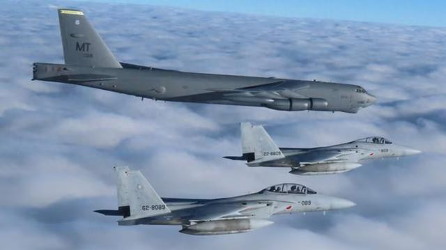 美军B-52轰炸机与日本航空自卫队F-15编队飞行