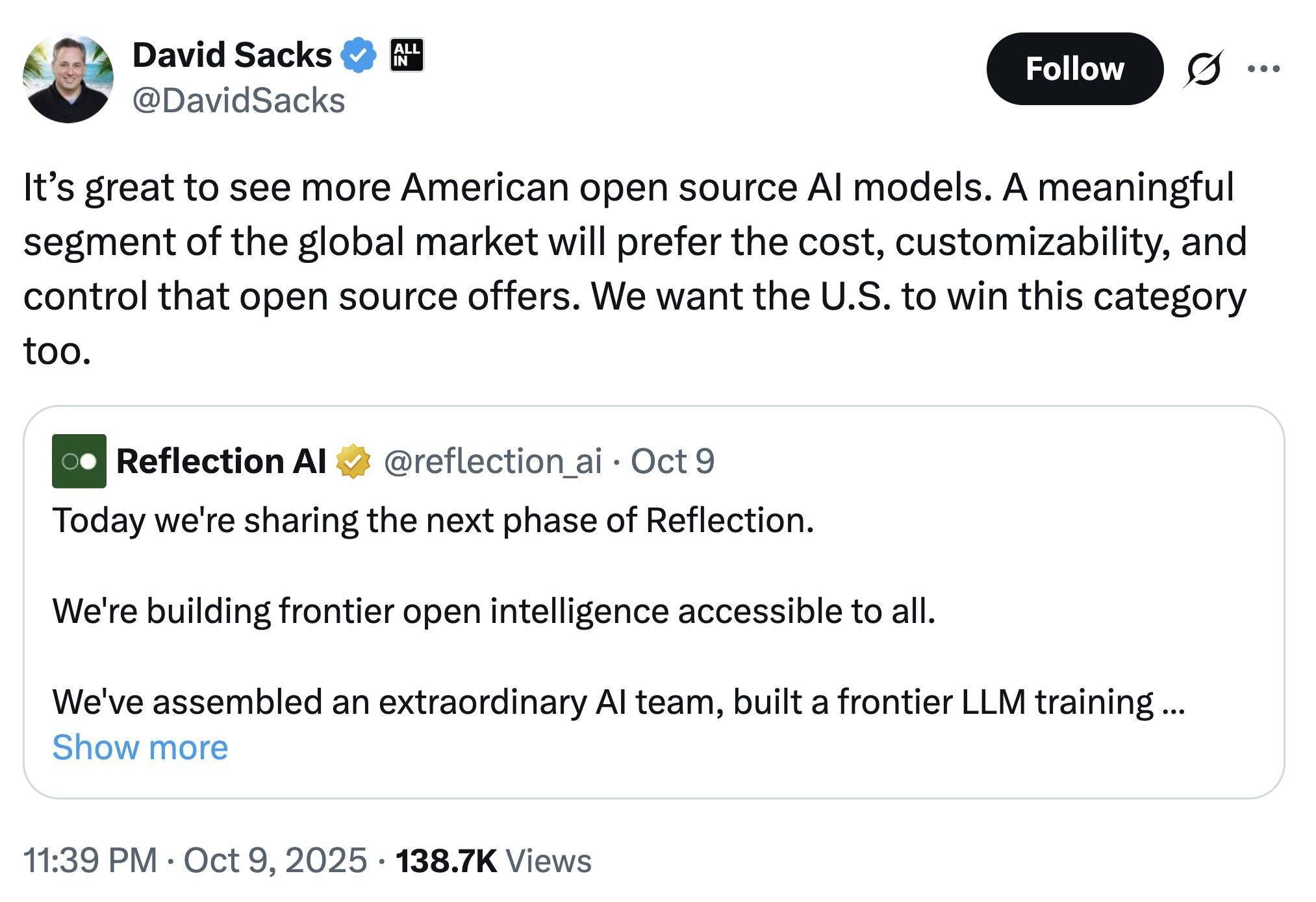 三、美国科技界力挺,“中国开源团队是警钟”Reflection AI此番融资与战略转型也获得美国科技界多个声音支持。白宫AI与加密货币事务专员David Sacks在社交平台上指出:“越来越多的美国开源模型出现令人振奋。全球市场的一个重要板块会倾向于成本可控、可定制化、可掌控的开源方案。美国必须赢下这个赛道。”