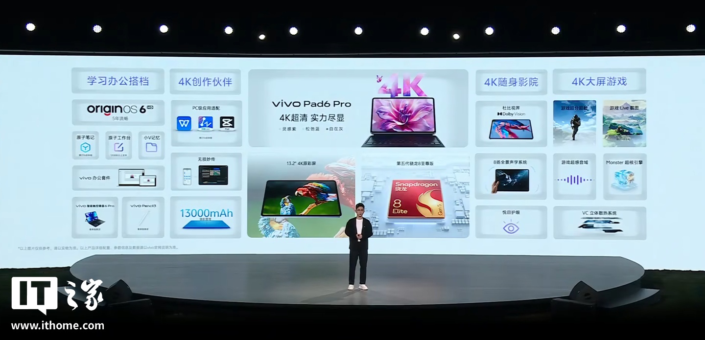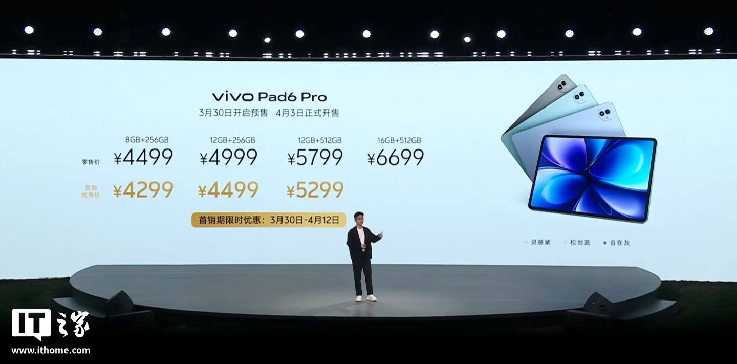 IT之家 3 月 30 日消息,vivo 今天召开春季新品发布会并推出 Pad 6 Pro 平板,搭载第五代骁龙 8 至尊版芯片,行业首发 13.2 英寸 4K 原彩屏,支持 PC 级 WPS+ 剪映专业版,标价 4499 元起、首销优惠价 4299 元起,优惠截至 4 月 12 日。