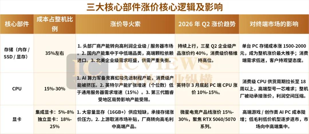存储、CPU、显卡,Q2继续涨一台AI PC的整机成本,大半都集中在存储、CPU、显卡三大核心硬件上,每一类硬件的涨价,都有各自的产业逻辑,多方压力叠加,便形成了难以逆转的涨价合力。结合一线调研情况来看,这三大核心部件的紧缺周期还没见顶,成本上行的压力仍在持续向下传导,远未到拐点。