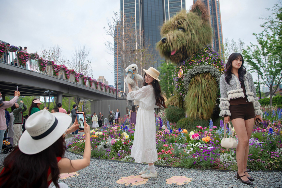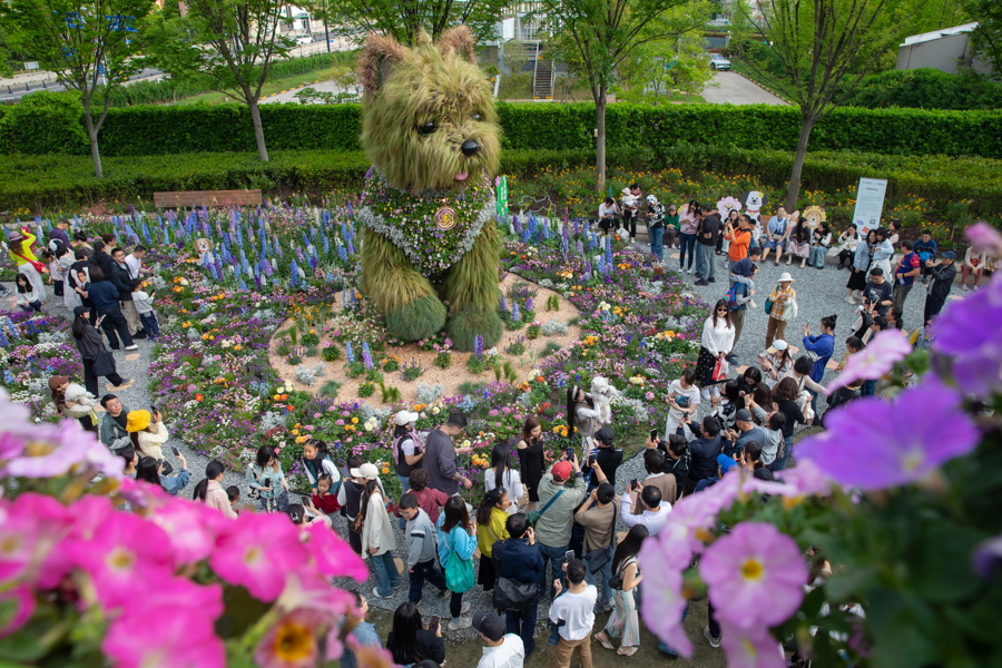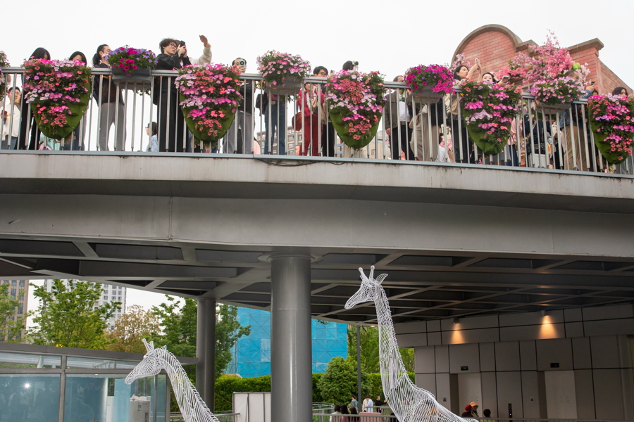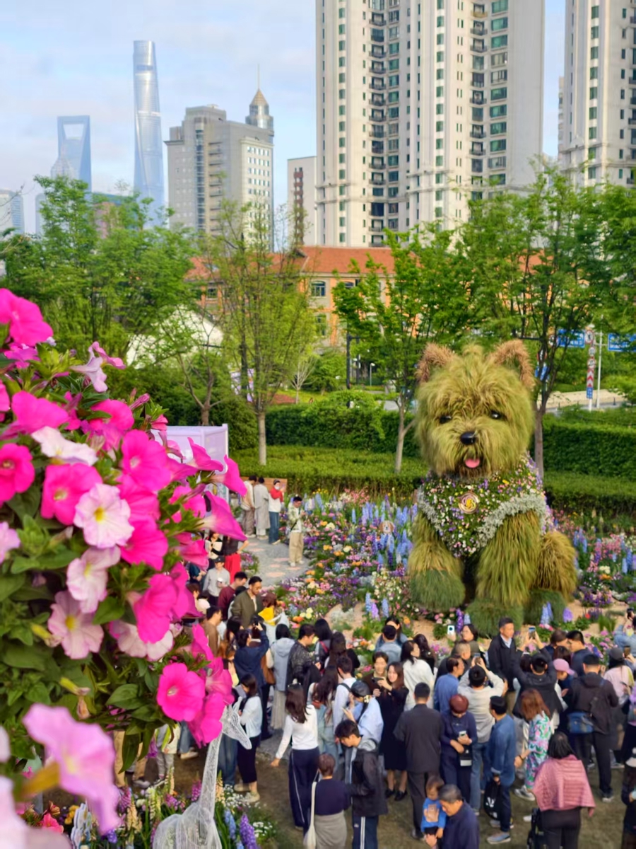 本届花卉节不仅花艺设计别具一格,更有多个打卡点在开幕前就已未展先火,刷屏网络。静安苏河湾展区内,一座名为“潦草小狗”的西高地白梗犬造型花艺雕塑,凭借憨厚中带着几分随性不羁的模样,迅速圈粉无数年轻人,一跃成为全场人气最高的“网红明星”。而“繁花里·空中石库门”景点同样热度不减,游客只需站在天桥拐弯处,便能将“空中石库门”与陆家嘴“三件套”一并收入镜头,完成一张“新旧上海同框”的穿越感大片,也因此成为必到打卡点。