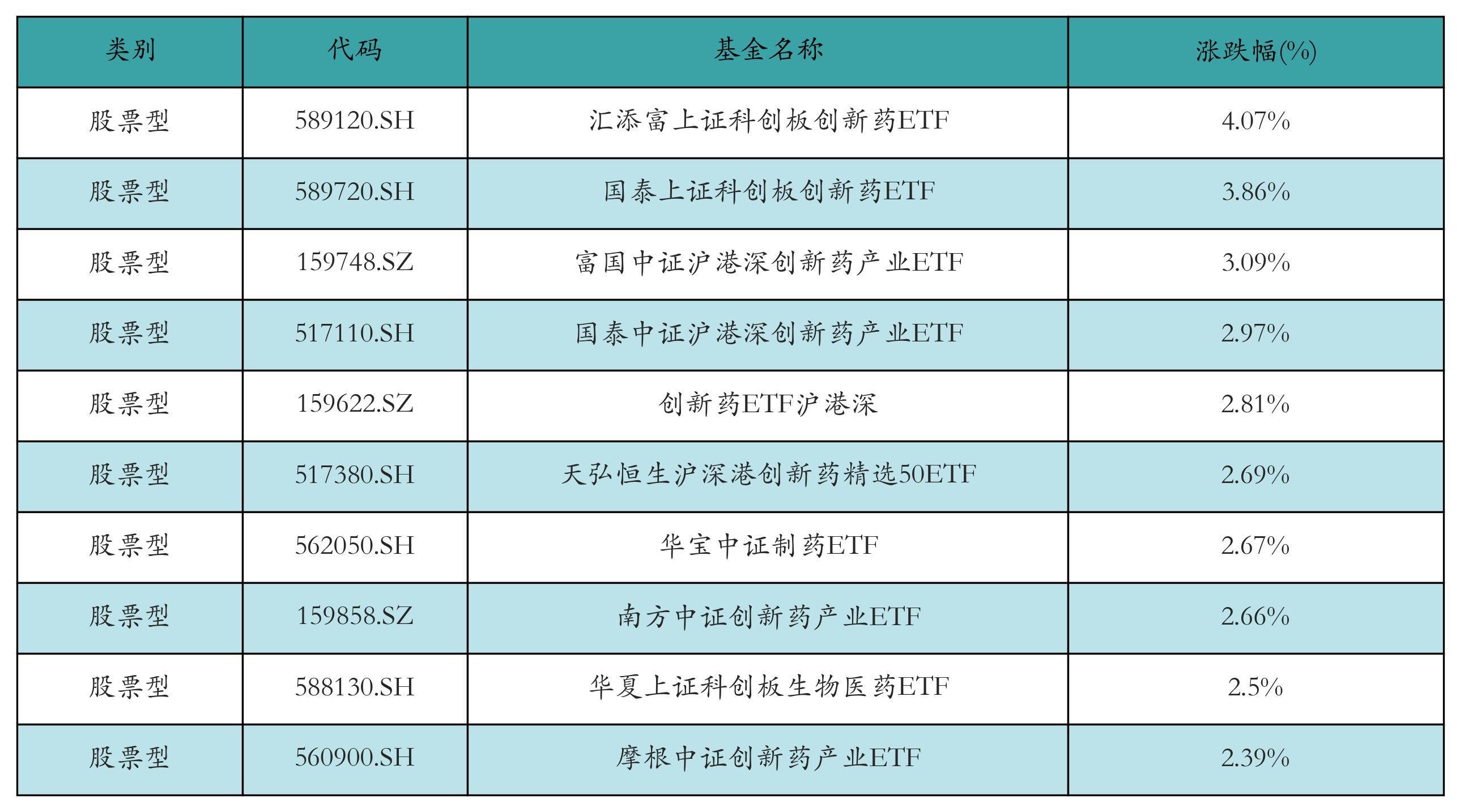 昨日股票型ETF涨幅最高的3只ETF及其收益率分别为:汇添富上证科创板创新药ETF(4.07%)、国泰上证科创板创新药ETF(3.86%)、富国中证沪港深创新药产业ETF(3.09%)。涨幅前10详情见下表: