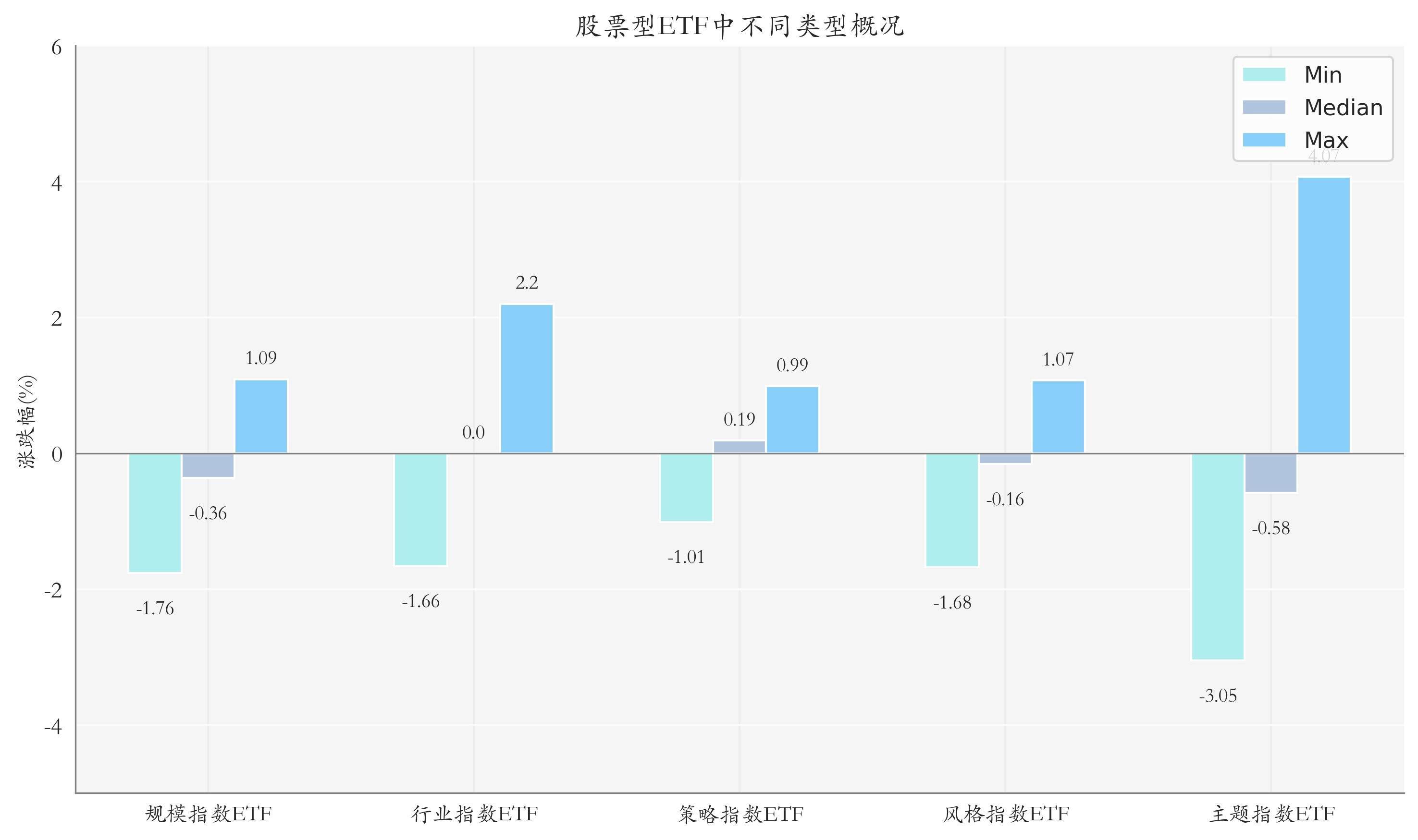 昨日股票型ETF收益率中位数为-0.41%。其中按照不同分类,规模指数ETF中天弘中证A500增强策略ETF收益率最高,为1.09%;行业指数ETF中华夏医药ETF收益率最高,为2.2%;策略指数ETF中平安中证A500红利低波动ETF收益率最高,为0.99%;风格指数ETF中华夏中证智选500价值稳健策略ETF收益率最高,为1.07%;主题指数ETF中汇添富上证科创板创新药ETF收益率最高,为4.07%。