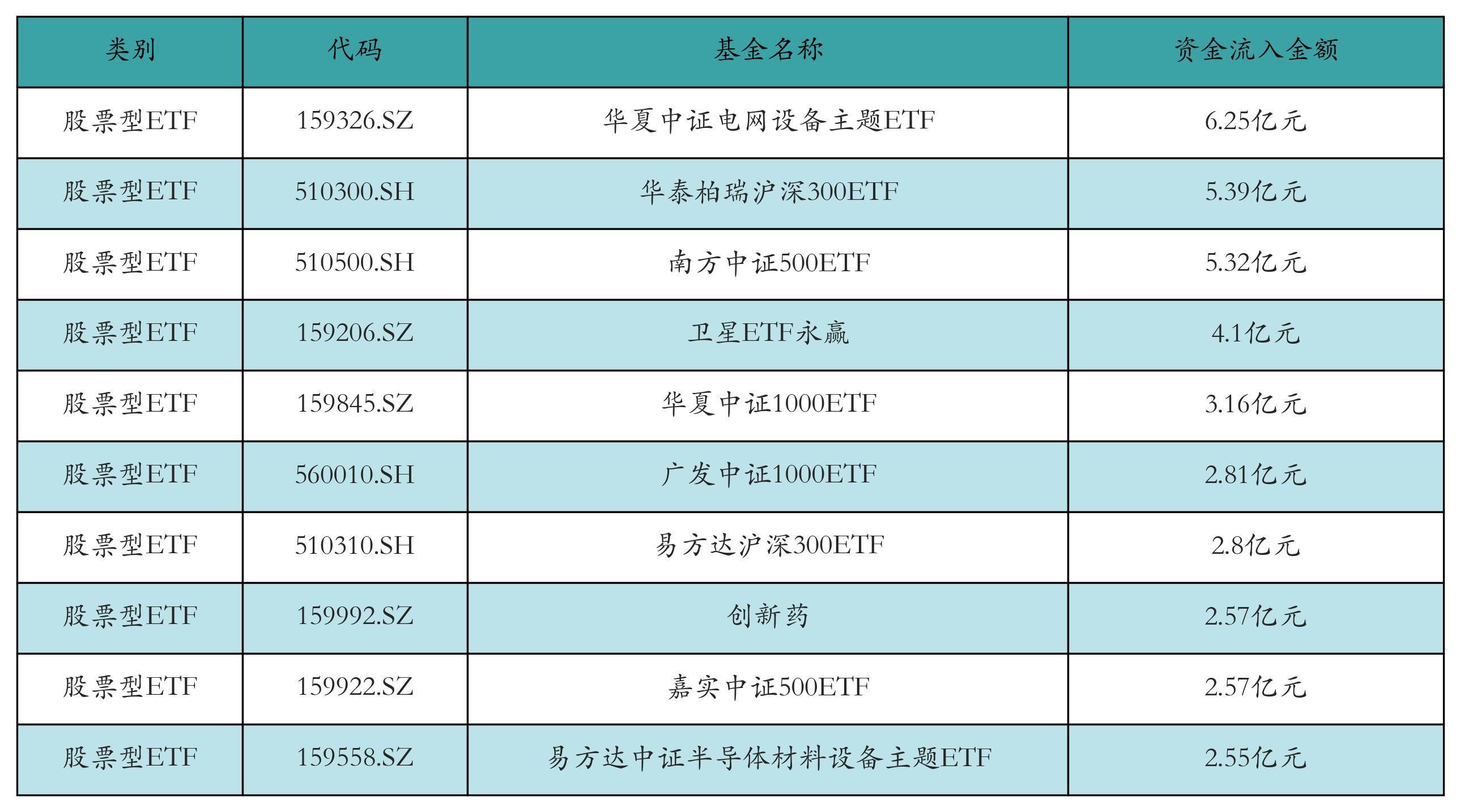 昨日股票型ETF资金流入最多的3只ETF及其流入金额分别为:华夏中证电网设备主题ETF(流入6.25亿元)、华泰柏瑞沪深300ETF(流入5.39亿元)、南方中证500ETF(流入5.32亿元)。资金流入前10详情见下表: