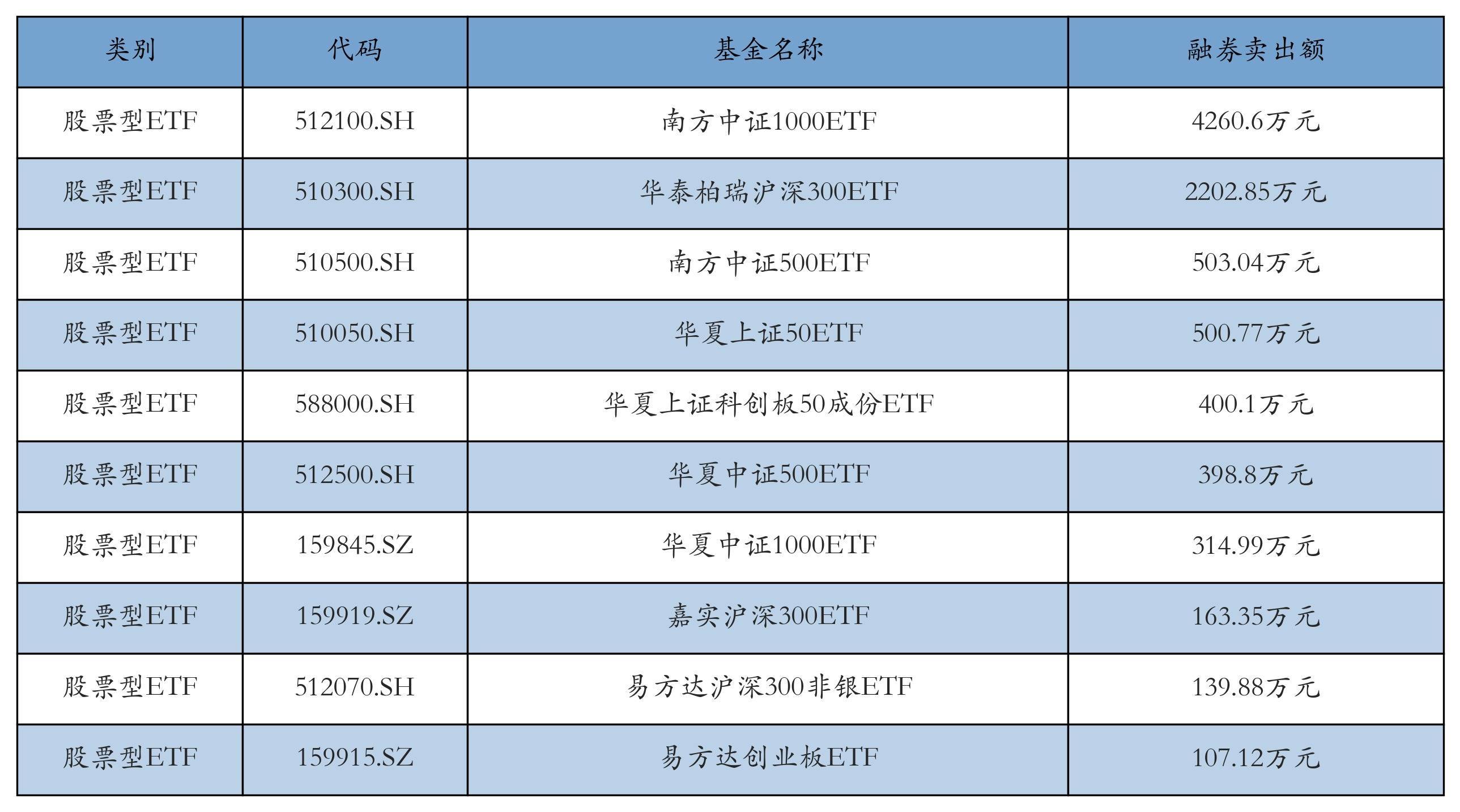 昨日股票型ETF融资卖出额最高的3只ETF及其卖出金额分别为:南方中证1000ETF(4260.6万元)、华泰柏瑞沪深300ETF(2202.85万元)、南方中证500ETF(503.04万元)。融券卖出额前10详情见下表: