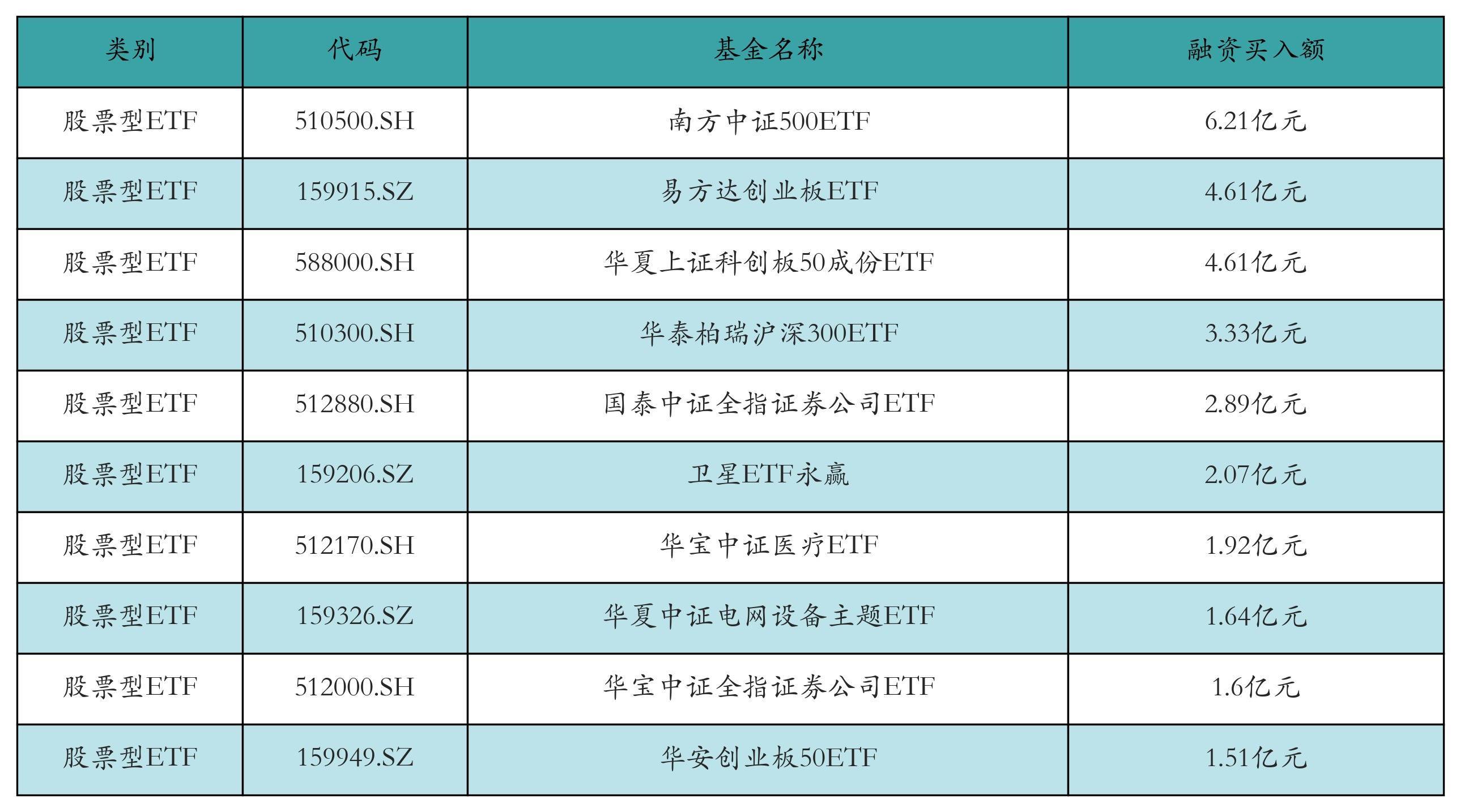 昨日股票型ETF融资买入额最高的3只ETF及其买入金额分别为:南方中证500ETF(6.21亿元)、易方达创业板ETF(4.61亿元)、华夏上证科创板50成份ETF(4.61亿元)。融资买入额前10详情见下表: