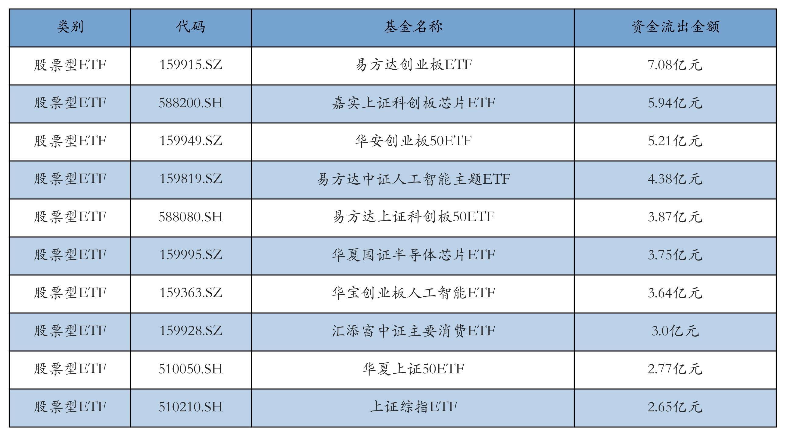 昨日股票型ETF资金流出最多的3只ETF及其流出金额分别为:易方达创业板ETF(流出7.08亿元)、嘉实上证科创板芯片ETF(流出5.94亿元)、华安创业板50ETF(流出5.21亿元)。资金流出前10详情见下表:
