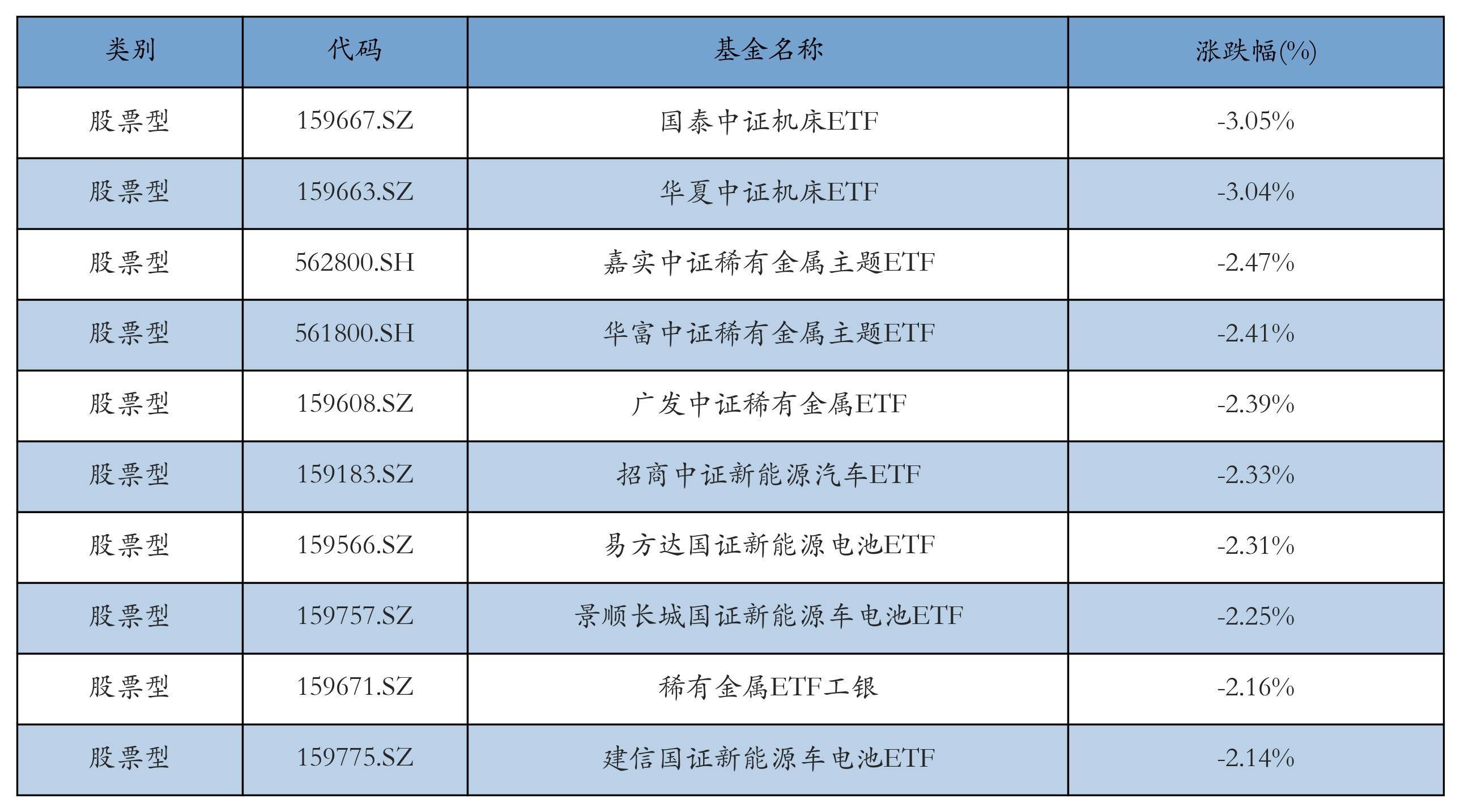 昨日股票型ETF跌幅最大的3只ETF及其收益率分别为:国泰中证机床ETF(-3.05%)、华夏中证机床ETF(-3.04%)、嘉实中证稀有金属主题ETF(-2.47%)。跌幅前10详情见下表: