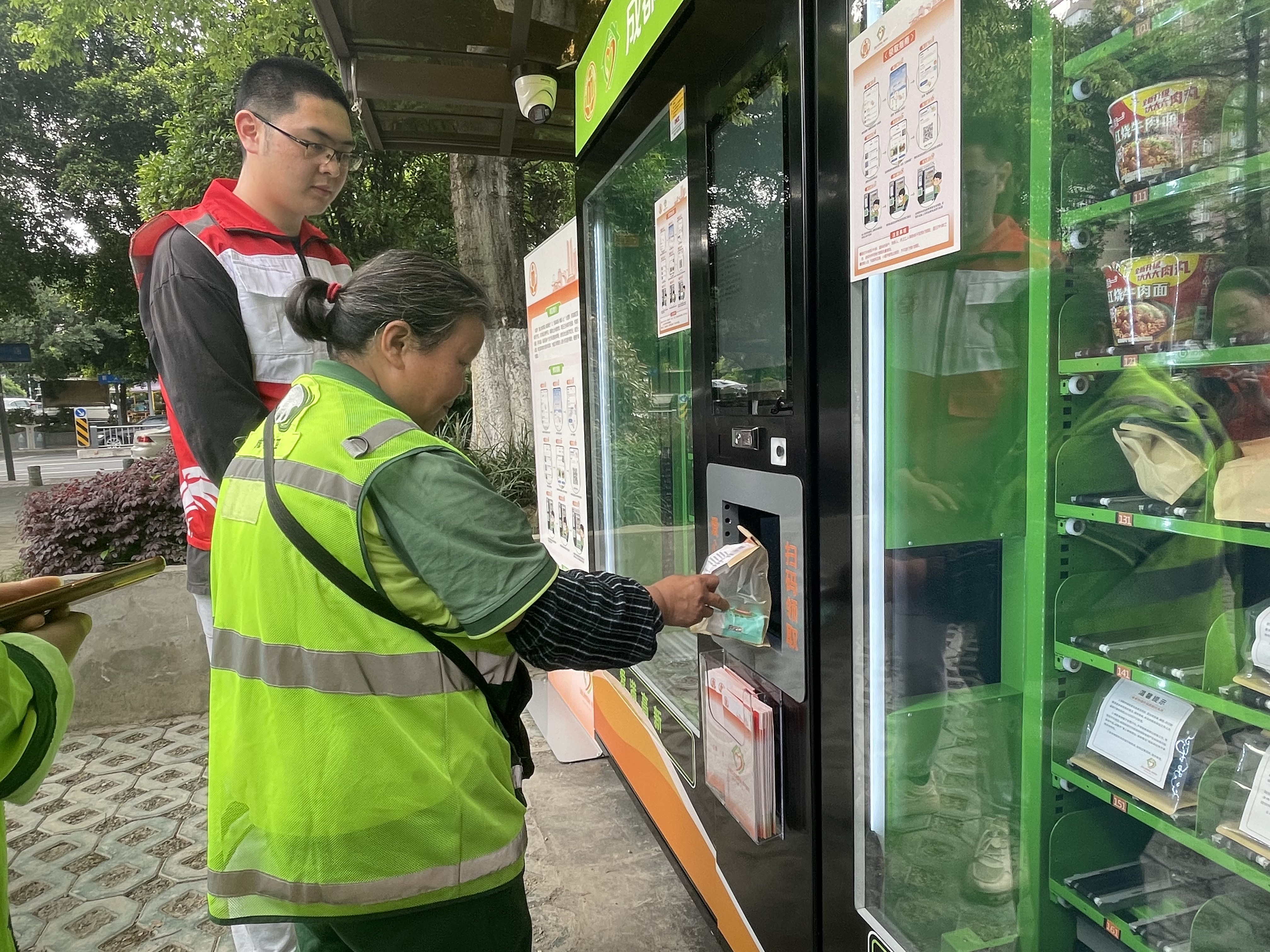陈先生是一名低保户,这也是驿站投运以来,他第一次领取爱心食物。“在驿站工作人员的帮助下完成了身份验证,之后领食物就方便了,只要预约领取即可。今天食物柜存放的有方便面、水果、蔬菜,我领了一份蔬菜,还挺新鲜的。”
