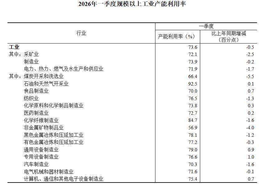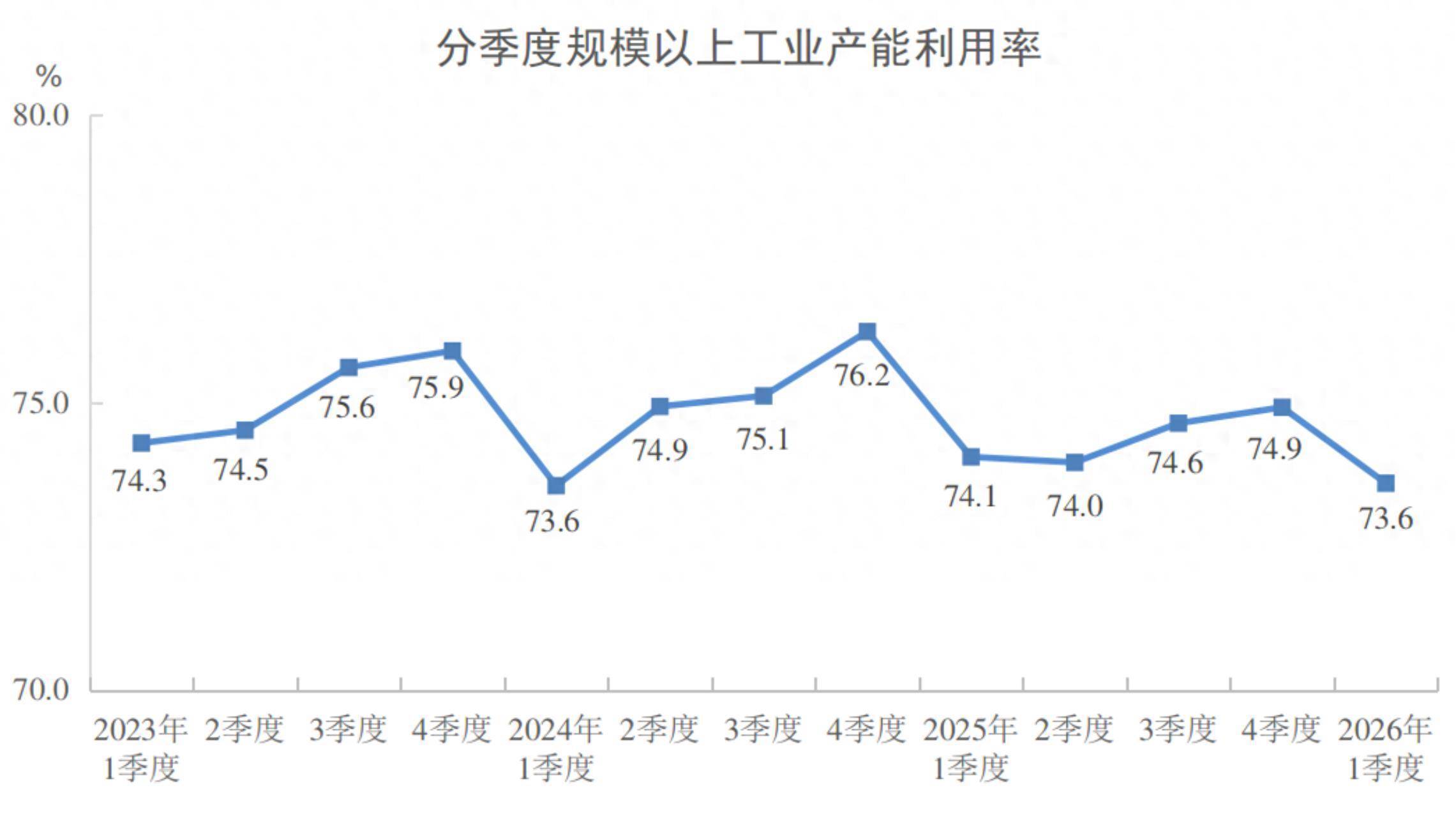智通财经APP获悉,国家统计局数据显示,2026年一季度,全国规模以上工业产能利用率为73.6%,比上年四季度下降1.3个百分点,比上年同期下降0.5个百分点。